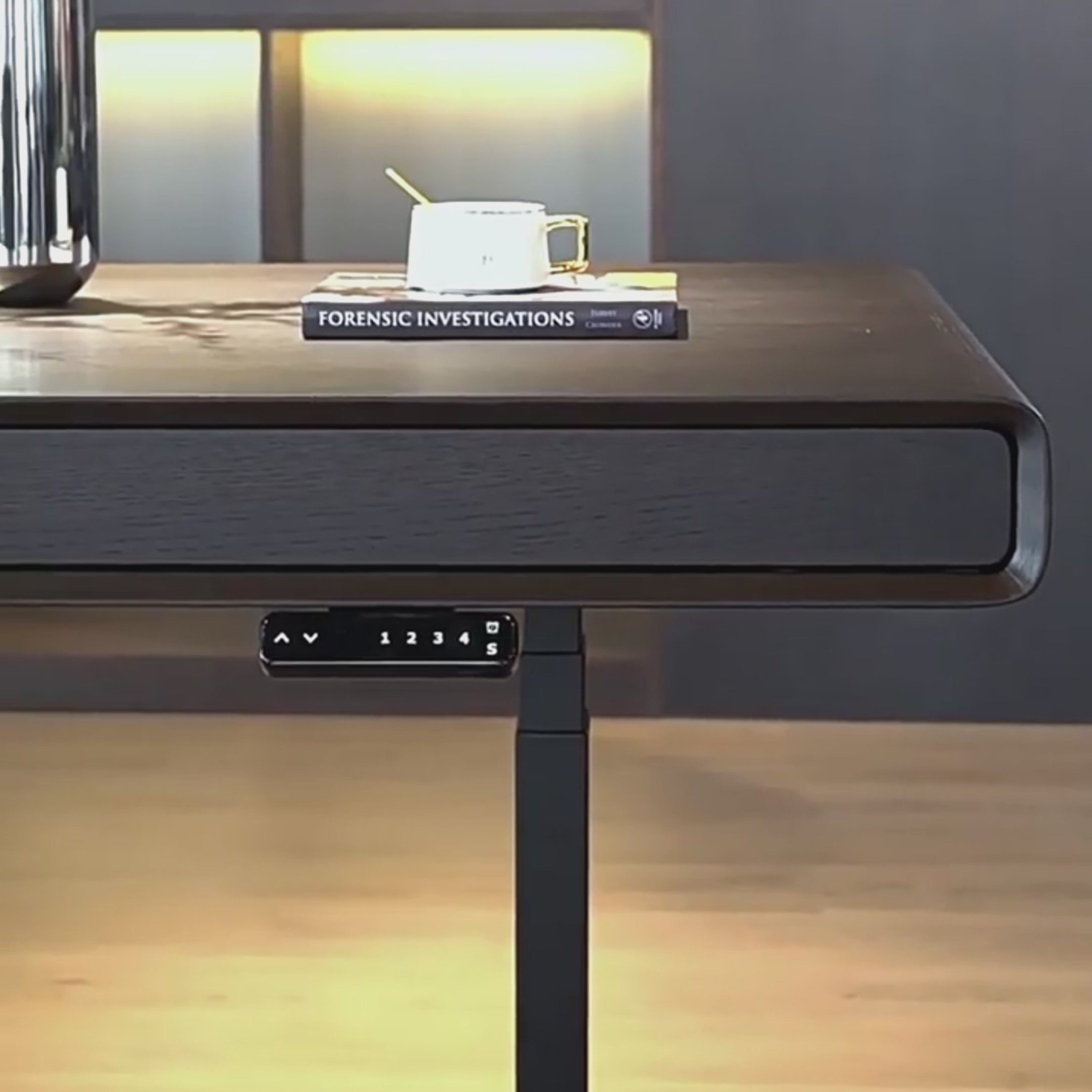 • Desk legs have a dual electric motor and are steel with a black matte paint